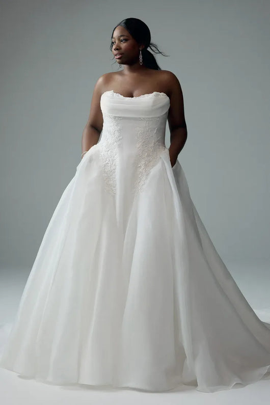 This sleek, princess ball gown promises to bring your regal wedding dreams to life, crafted from luxurious organza. It represents all things modern, with its sexy, scoop neckline and bodice that features floral lace placed to contour the body. The bodice is adorned with a distinctive touch—a panel of ruched organza set just below the neckline.