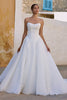 Strapless ball gown, promises to bring your regal wedding dreams to life, crafted from luxurious organza. It represents all things modern, with its sexy, scoop neckline and bodice that features floral lace placed to contour the body. The bodice is adorned with a distinctive touch—a panel of ruched organza set just below the neckline.